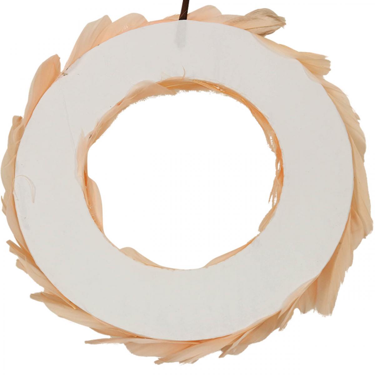 Fuglefjær, farget i den mest delikate oransje, er harmonisk arrangert på denne kransen. Grunnlaget for den dekorative kransen er en buet styrofoam-ring som dekorfjærene kommer til sin rett på. En brun henger fullfører fjærkransen.