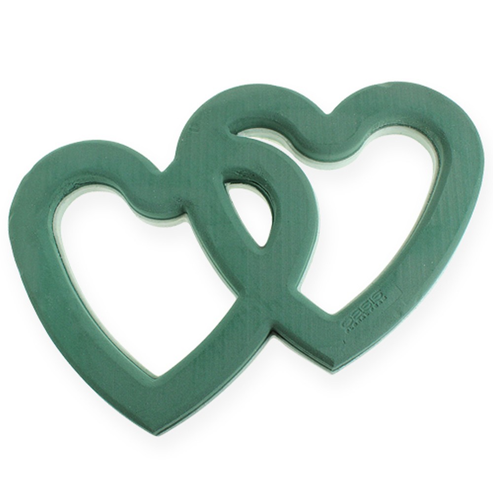 Duohjerte laget av vått blomsterskum med en spen leveres som en dobbel pakke; så du får 2 doble hjerter å dekorere. Hvert duohjerte er omtrent 37 x 58 x 5 centimeter stort og har en hard skumbase. Du vil motta totalt fire sugekopper per duohjerte.