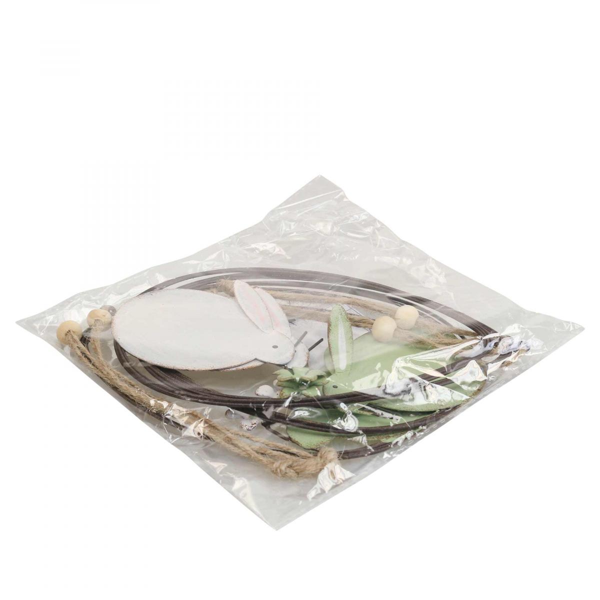 Denne vindusdekorasjonen i form av en påskehare laget av metall er en vakker hengende dekorasjon til påsken. Den sittende kaninen er satt i midten av et egg og kommer fargerik med grønn eller hvit pels.Det hvite kaninhenget sitter vendt mot høyre, den grønne påskeharen vendt mot venstre. Hver av påskeharene bærer en blomst med kronblader i den andre fargen i munnen.