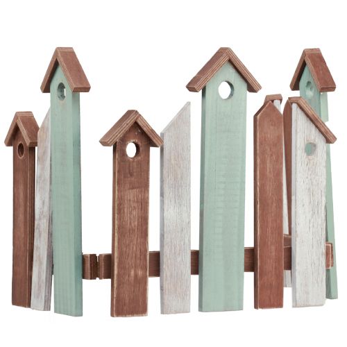 For denne bordskjermdekorasjonen er en rekke smale, enkle hus stilt opp som en gjerdestolpe.Bord- eller vindusskjermen er laget av tre og brettes to ganger med små metallhengsler. Dette betyr at du raskt og enkelt kan sette opp den dekorative skjermen som romdeler på en jevn overflate.