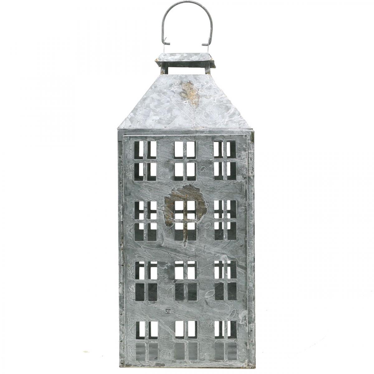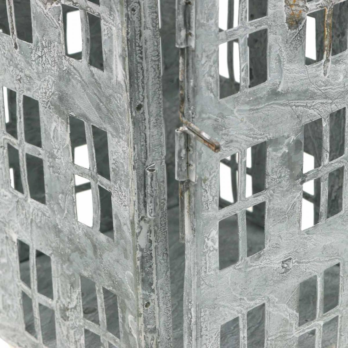 Vintageutseendet til melkeaktig dis og rustflekker er resultatet av at lykten ble vasket hvit. Lysholderen ser ut som et høyhus i miniatyr og, med passende lyskilde, ser den bebodd ut, spesielt i mørket.