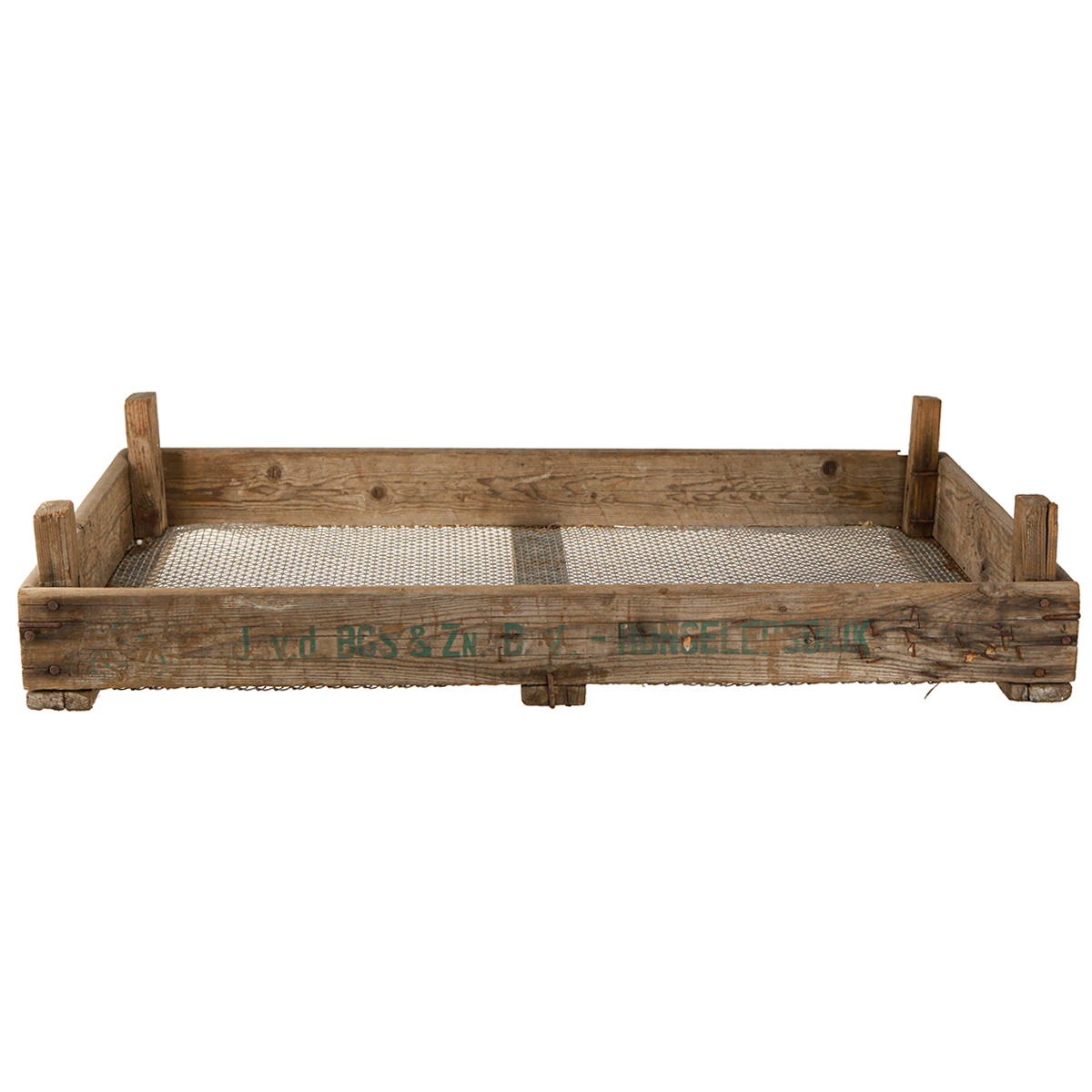 Treverket i denne flate, vintage trekassen fremmer en beroligende, naturlig atmosfære. Tre som materiale formidler varme og trygghet. Det naturlige, umalte treverket passer vakkert sammen med planter og blomster av alle slag, spesielt grønne planter, som kan bidra til harmoni og balanse.