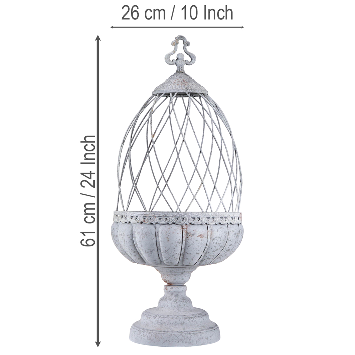 Den vintage troféskålen i metall er et ekstraordinært blikkfang for hjemme- eller hagearrangementet ditt. Designet som et antikt fuglebur, møter vintagedesignet en shabby chic finish. Med sin elegante, grå og hvite overflate og sjarmerende rustdetaljer, bringer denne metalldekorasjonen et snev av nostalgi til ethvert rom. Denne dekorative troféskålen er allsidig: enten den er en eksklusiv vintage blomstervase eller et stilig fuglebur i metall, med sin avtakbare topp er den et retrotilbehør i en klasse for seg. Kombinasjonen av troféskål og metallisk topp i fugleburdesign kan ideelt kombineres med andre elementer av landsted eller boho-innredning. Den utfolder sin fulle effekt spesielt i stuen eller som blikkfang på arrangementer. La kreativiteten løpe løpsk og dekorer bollen med fjærkledde fugler, kunstige sommerfugler eller vinranker for å lage et individuelt arrangement.